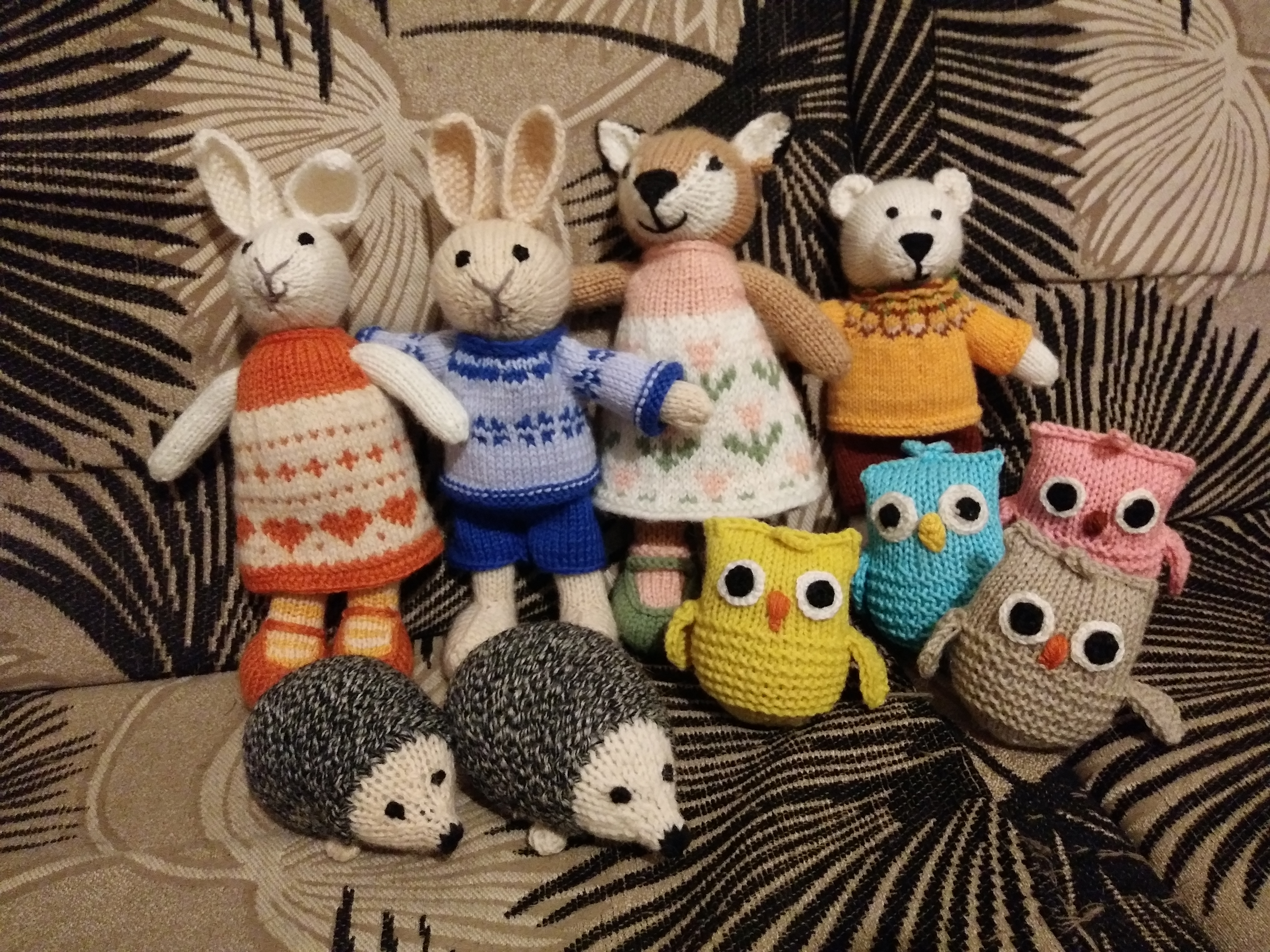 Мы вяжем игрушечки из шерсти, хлопка, бамбука и акрила, наполнитель — холлофайбер. Размер игрушек от 6 до 20 см. — в зависимости от коллекции. Совы и ежики — от 6 до 10 см., лисички, зайки, мишки и тп. — от 15 до 20 см. Одежда снимается.